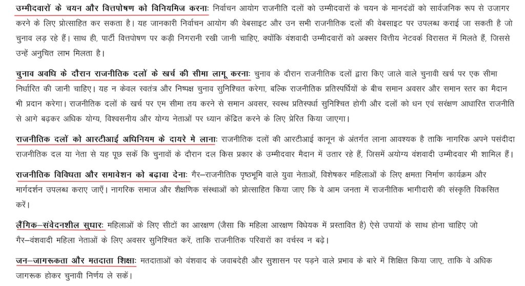- वामपंथी और नए सुधारवादी दलों में वंशवाद सबसे कम है, जो अभिजात्यवाद के विरुद्ध उनकी वैचारिक स्थिति के अनुरूप है। इसके विपरीत, “सामाजिक न्याय” या जाति-आधारित क्षेत्रीय दलों में 30-40% वंशवाद देखने को मिलता है।