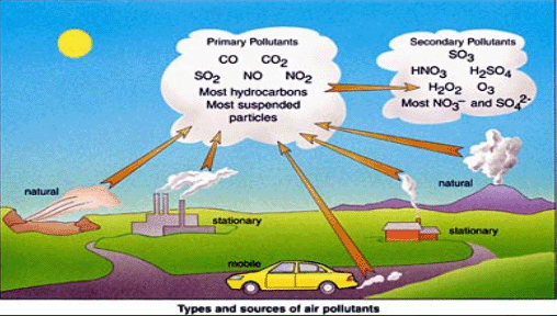 प्राथमिक प्रदूषक (Primary Pollutants) सीधे तौर पर सड़क की धूल के पुनः वाष्पीकरण, निर्माण कार्य, खुले में आग जलाने, वाहनों के धुएं और उद्योगों जैसे कारकों से उत्पन्न होते हैं। दूसरी ओर, द्वितीयक प्रदूषक गैसों के वायु में छोड़े जाने के बाद बनते हैं। ये गैसें, जिन्हें पूर्ववर्ती प्रदूषक कहा जाता है, आर्द्रता, तापमान और सूर्य के प्रकाश से प्रभावित होकर रासायनिक अभिक्रियाओं से गुजरती हैं। अंततः ये सूक्ष्म कणों का निर्माण करती हैं जो फेफड़ों में गहराई तक प्रवेश कर जाते हैं। Example: Ground level Ozone.